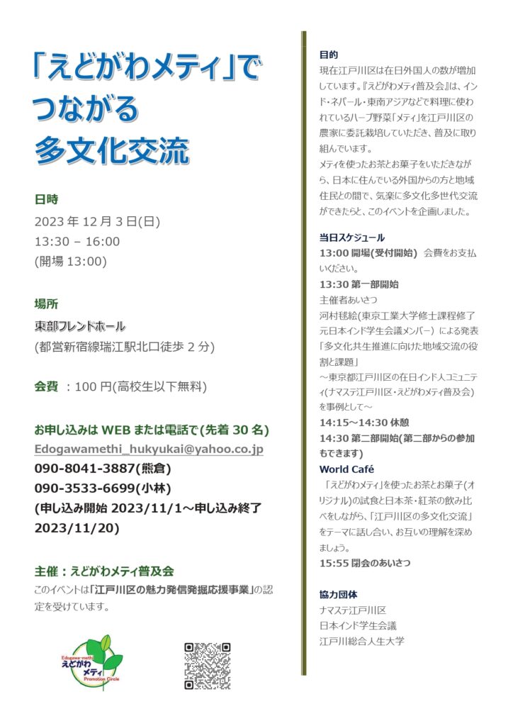 🗣️2023年12月3日(日)13:30~16:00 東部フレンドホールおいて「えどがわメティ普及会」主催の多文化多世代交流イベントが開催されます。