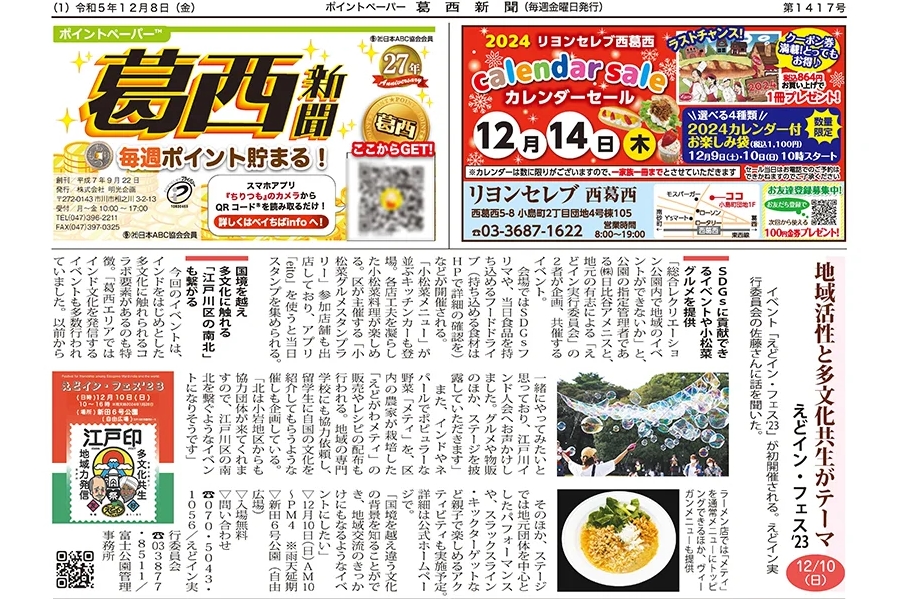 【メディア紹介】「葛西新聞」2023年12月8日号1面のトップ記事を飾らせて頂きました!